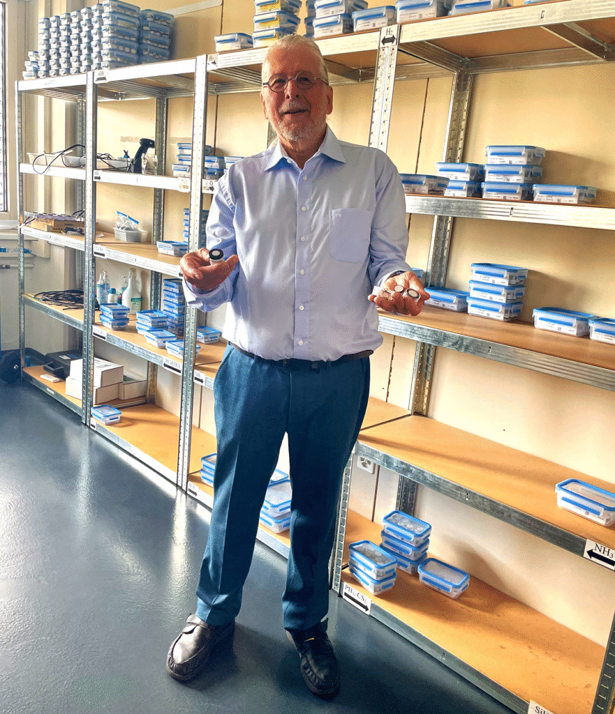 Dr. Christian Huggenberger mit einigen “seiner” Gas-Sensoren am heutigen Firmensitz der Membrapor AG in Wallisellen.